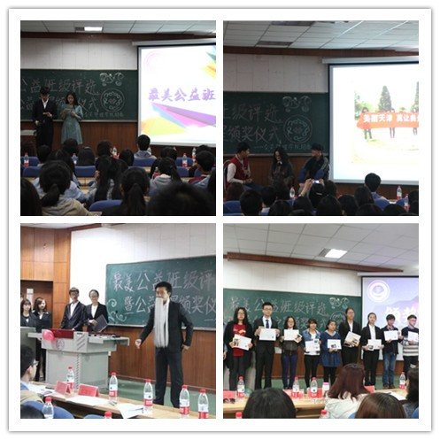 公益展示环节结束后,培智公司高主任为同学们讲述她的特教经历,字句间无不透露出她的公益爱心。沈洁老师也深情感言,希冀公管莘莘学子不忘初衷,用心做公益。最后,到场嘉宾为沈怡均,宋爽等11位最美公益之星及最美公益班级颁奖:1406班、1402班、1404班、1409班分别获得最具实践意义公益班级,最具研究价值公益班级,最具发展前景公益班级及最具风采展示公益班级。1405班夺得桂冠,获得年度最美公益班级称号。